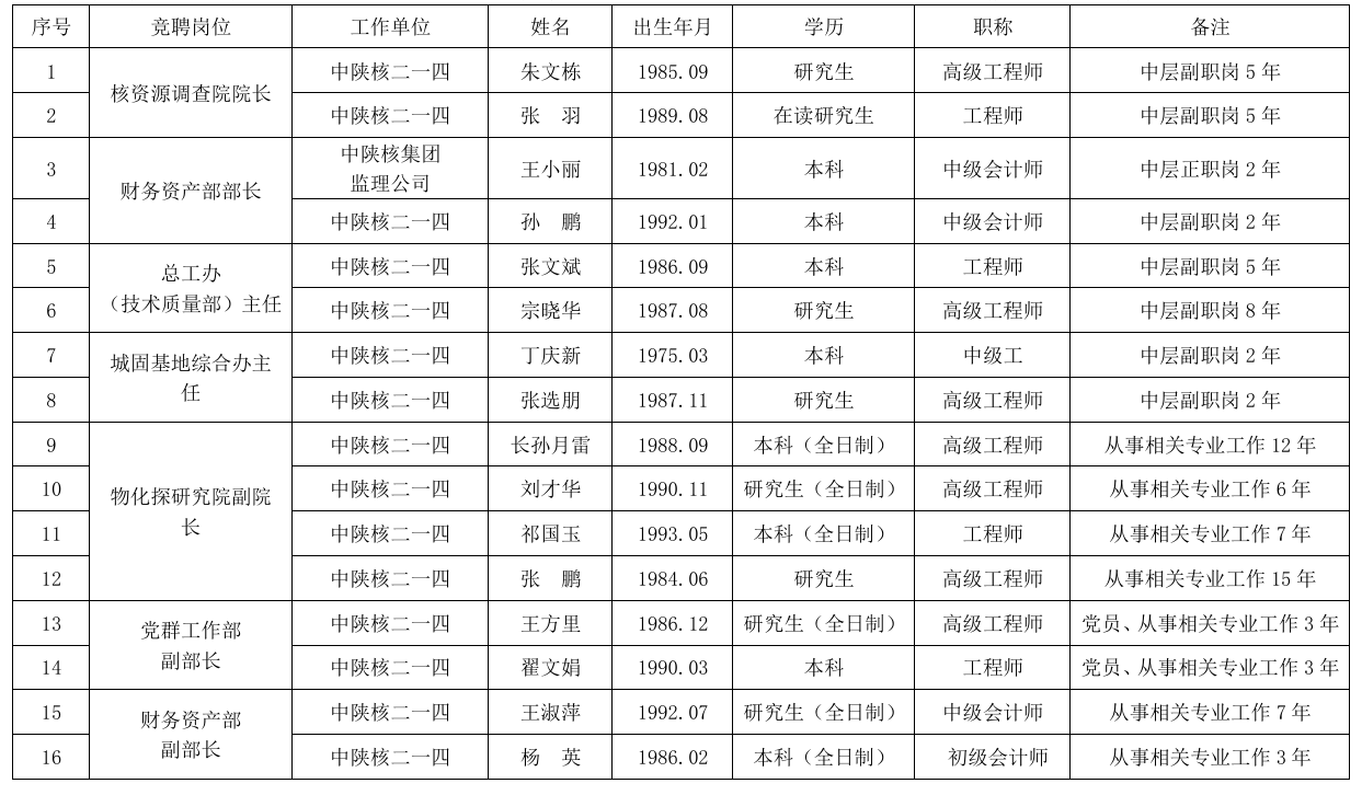 根據(jù)中陜核工業(yè)集團(tuán)二一四大隊有限公司《中層管理人員選聘工作方案》有關(guān)要求,現(xiàn)對資格審查通過的報名人員予以公示: