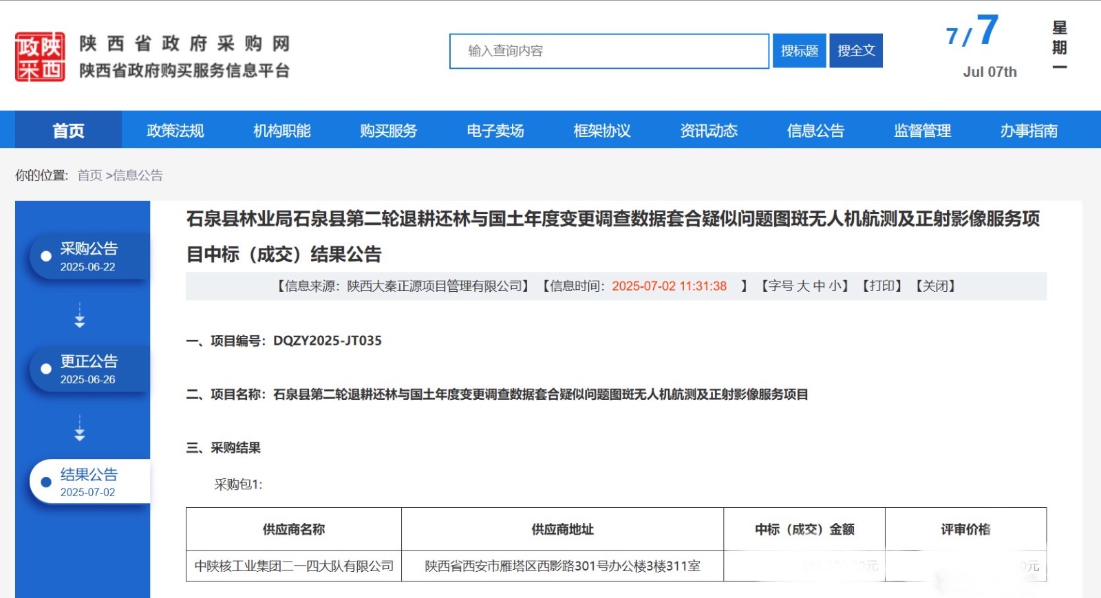 近日,公司物化探院成功中標《石泉縣第二輪退耕還林與國土年度變更調查數據套合疑似問題圖斑核查項目》及《石泉縣第二輪退耕還林與國土年度變更調查數據套合疑似問題圖斑無人機航測及正射影像服務項目》。