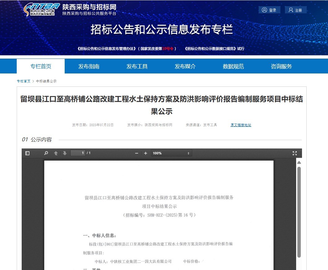 722日,從陜西采購與招標網傳來喜訊,公司成功中標《留壩縣江口至高橋鋪公路改建工程水土保持方案及防洪影響評價報告編制服務項目》。