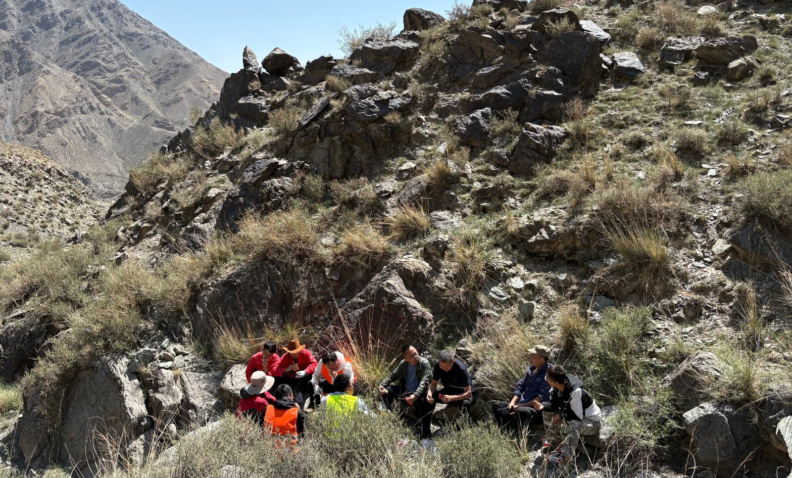 隨后,付星與項目人員在山坡一平緩地帶舉行了座談交流。他指出,和靜物探項目作為公司模擬法人制試點項目之一,項目組要高度重視、精心謀劃、細化流程,并做好經驗總結,為后續項目樹立好標桿。同時,要弘揚地質隊“三光榮、四特別”的優良傳統,克服極端地形困難,堅守崗位、履職盡責,以高度責任感和專業精神推動項目穩步實施。付星特別強調,此次項目地處天山南麓山區,山勢陡峭、環境艱苦,作業過程中必提高安全意識,須嚴格落實安全保障措施,規范操作流程,堅決杜絕安全事故發生。